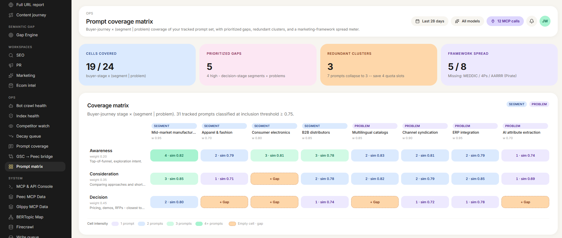 Under the hood it orchestrates four interoperating MCP servers (Peec, Ahrefs, GSC Wizard, Glippy) plus wrapped Ahrefs Firehose, Majestic, and Botsanalyser APIs, and collapses what would otherwise be 3-7 expert MCP calls into one department-shaped answer per page. Every action emits a tracked ID and gets re-checked at T+14 and T+28, so “we shipped a fix, did it work?” stops being a guess. Built for in-house teams who want a full-funnel GEO operating system, and for agencies that want one inbox of severity × MRR across every client.